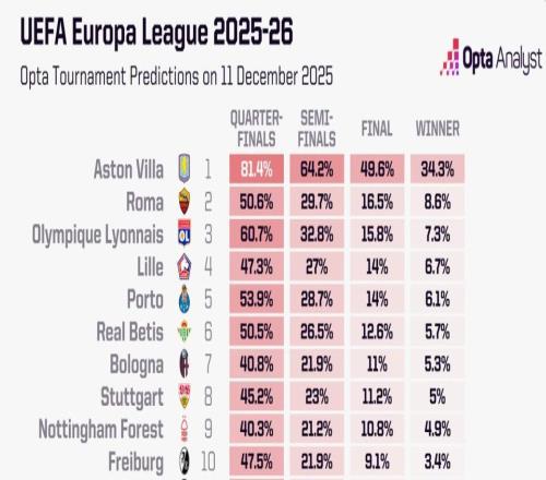 Opta预测本赛季欧联杯成绩:维拉夺冠概率超34%高居第一